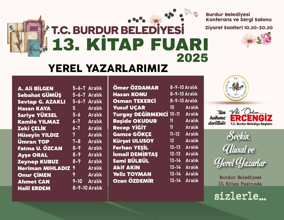 7’den 70’e tün kitapseverlere hitap edecek olan fuarda bu yıl aralarında Ercan Kesal, Sunay Akın, Işıl Işık, Serdar Vatansever, Saliha Erdim, Necmi Aksu, Gökmen Arslan, Kenan Demir, Cemil Kılıç, Mustafa Balbay, Savaş Öztürk, Dilek Cesur, Sinan Yağmur, İbrahim Kahveci söyleşileriyle etkinliğe renk katacak. Ayrıca, yerel yazarlarımız da bu yıl fuarımıza katılarak, Burdur’un kültür ve edebiyat dünyasına katkılarını paylaşacak.